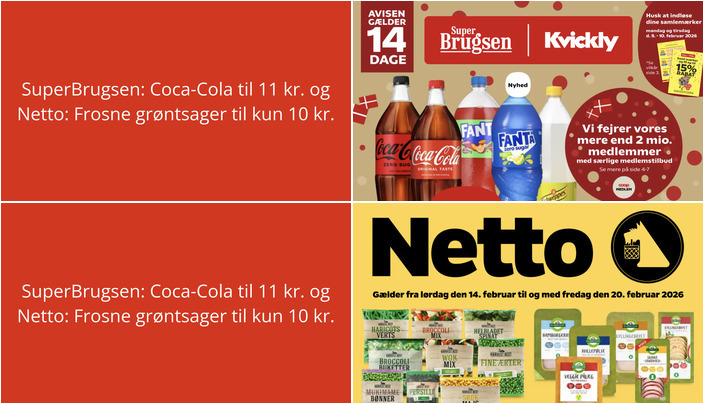 SuperBrugsen tilbyder Coca-Cola, Fanta eller Schweppes i flere varianter (125-150 cl) til kun 11 kr. pr. flaske. Tilbuddet gælder fra fredag den 6. februar til og med torsdag den 19. februar 2026.